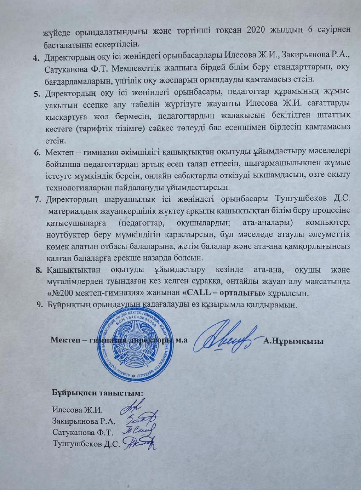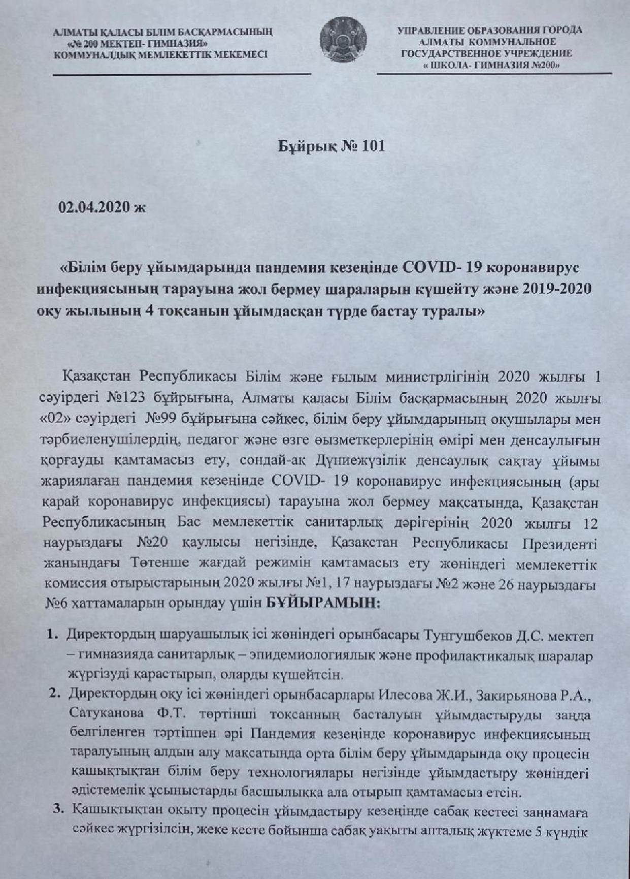 02 апрель 2020 0 1 2 3 4 5 COVID-19 короновирустық инфекцияның таралуына жол бермеу шараларын күшейту және 2019-2020 оқу жылының 4 тоқсанның ұйымдасқан түрде бастау туралы Бұйрық №101