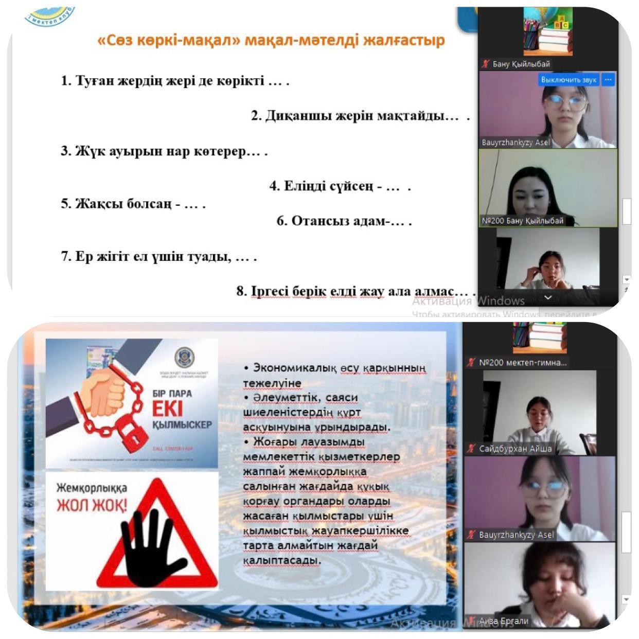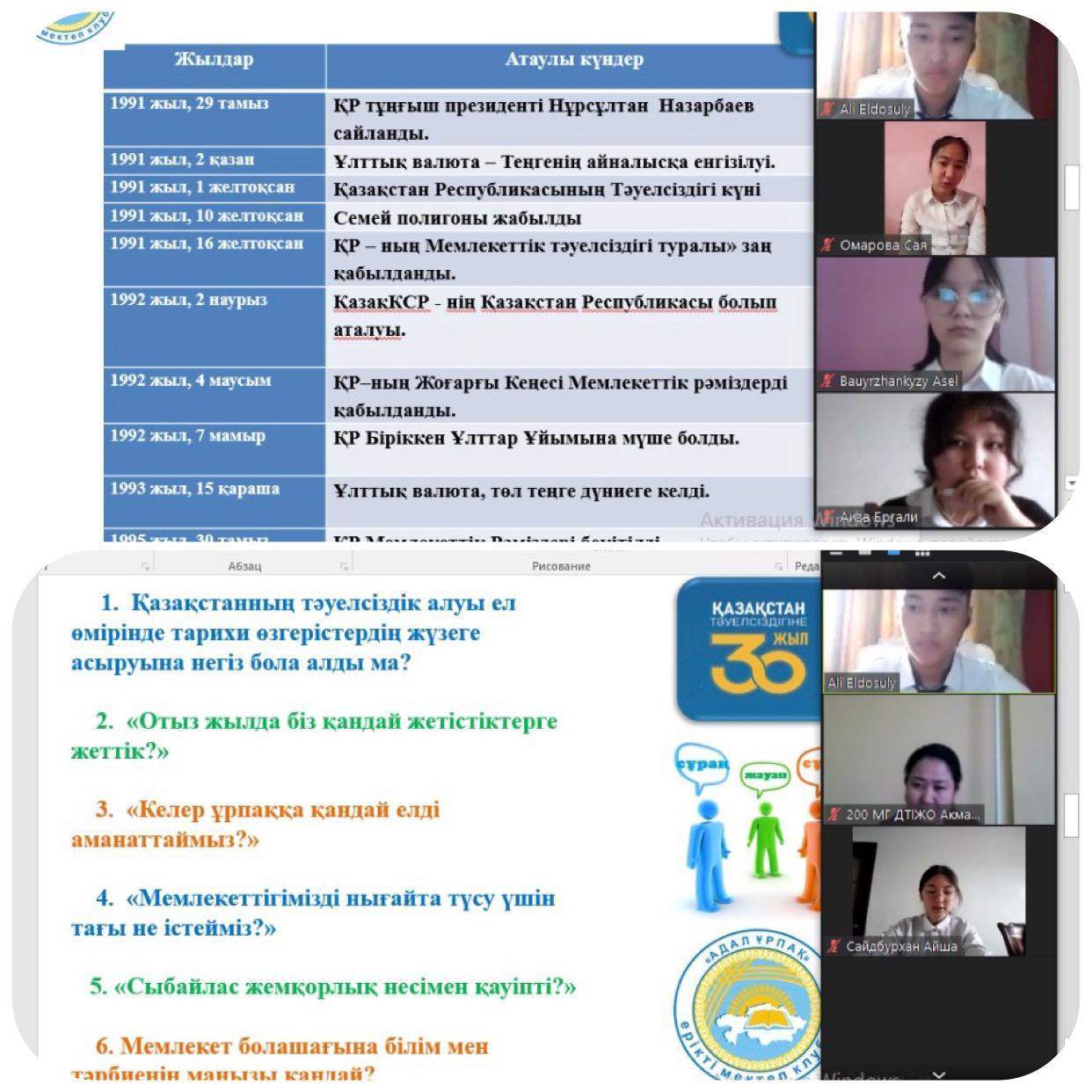 Қазақстан Республикасының Тәуелсіздігінің 30 жылдығына орай №200 мектеп-гимназиясының аға тәлімгері Б.К.Қыйлыбай «Адал Ұрпақ» ерікті мектеп клубының мүшелерімен «Тәуелсіз елдің ұрпағымын» атты тақырыпта қашықтықтан дебат өткізді.