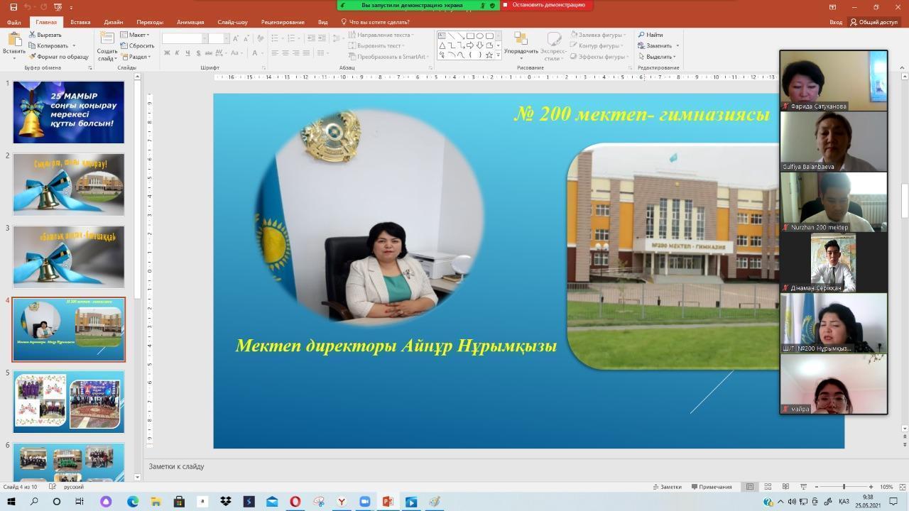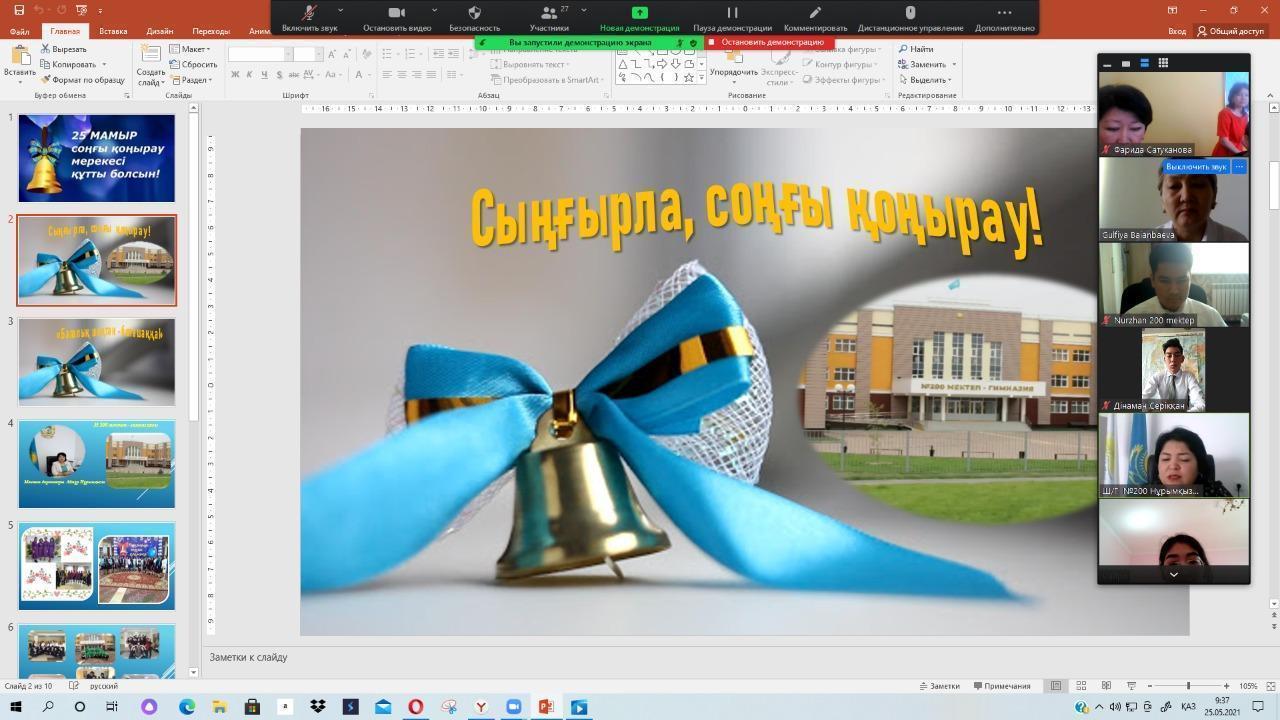 Бүгін 25 мамыр. Наурызбай ауданы №200 мектеп- гимназиясында кезекті оқу жылы аяқталды. Еліміздегі Эпидемиологиялық жағдайға байланысты 11-ші сынып түлектерінің мектеппен қоштасу салтанатты жиыны online zoom форматында «Сыңғырла соңғы қоңырау, Балалық шақтан – болашаққа» тақырыбында өтті. Бұл күн – мектеп тарихында, мектеп бітіруші түлектердің өмір тарихында мәңгі есте қалатын күн.