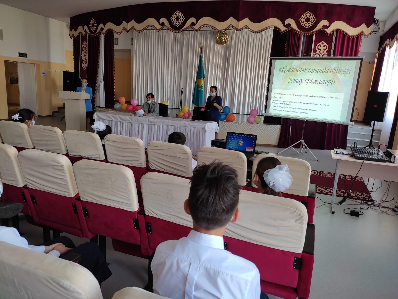 2021 жылдың 16 қыркүйек күні №200 мектеп – гимназиясында директордың тәрбие ісі жөніндегі орынбасарлары Е.С.Рахманбердиев, А.Л.Салкинбекова ағылшын тілі пәнінің мұғалімі А.Т.Сұлтанның ұйымдастыруымен 8 – 9 сынып оқушылары арасында «Қоғамдық ортада өзін – өзі ұстау ережелері» атты тақырыбында түсіндірме жұмыстары жүргізілді.