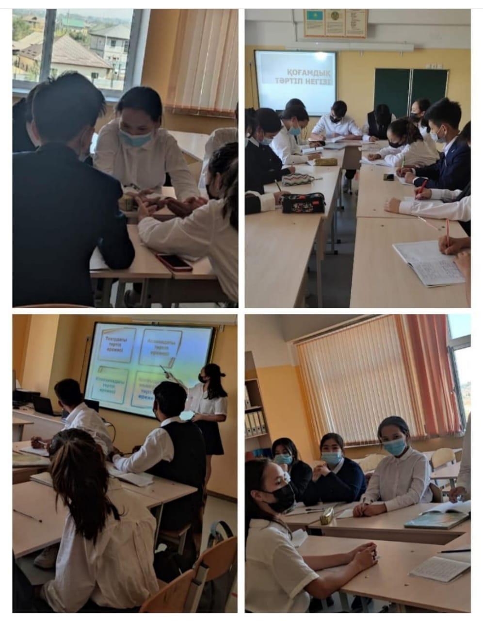 2021 жылдың 24 қыркүйек күні "Адал ұрпақ" ерікті мектеп клубының жетекшісі А.Д.Елеуова 9 сынып білім алушыларымен "Қоғамдық тәртіп негізі" атты дөңгелек үстел пікірсайысын өткізді. Оқушылар топқа бөлініп, коммуникативті мәдениетті қалыптастыру бағытында жұмыс жасады. Мақсат: Білім алушыларды сабақта, сабақтан тыс уақытта қоғамдық, көпшілік орындарда өзін-өзі ұстай білуге дағдыландыру, әдепті, сыпайы болуға үйрету. Адамдармен жақсы қарым-қатынас жасауды уйрету.