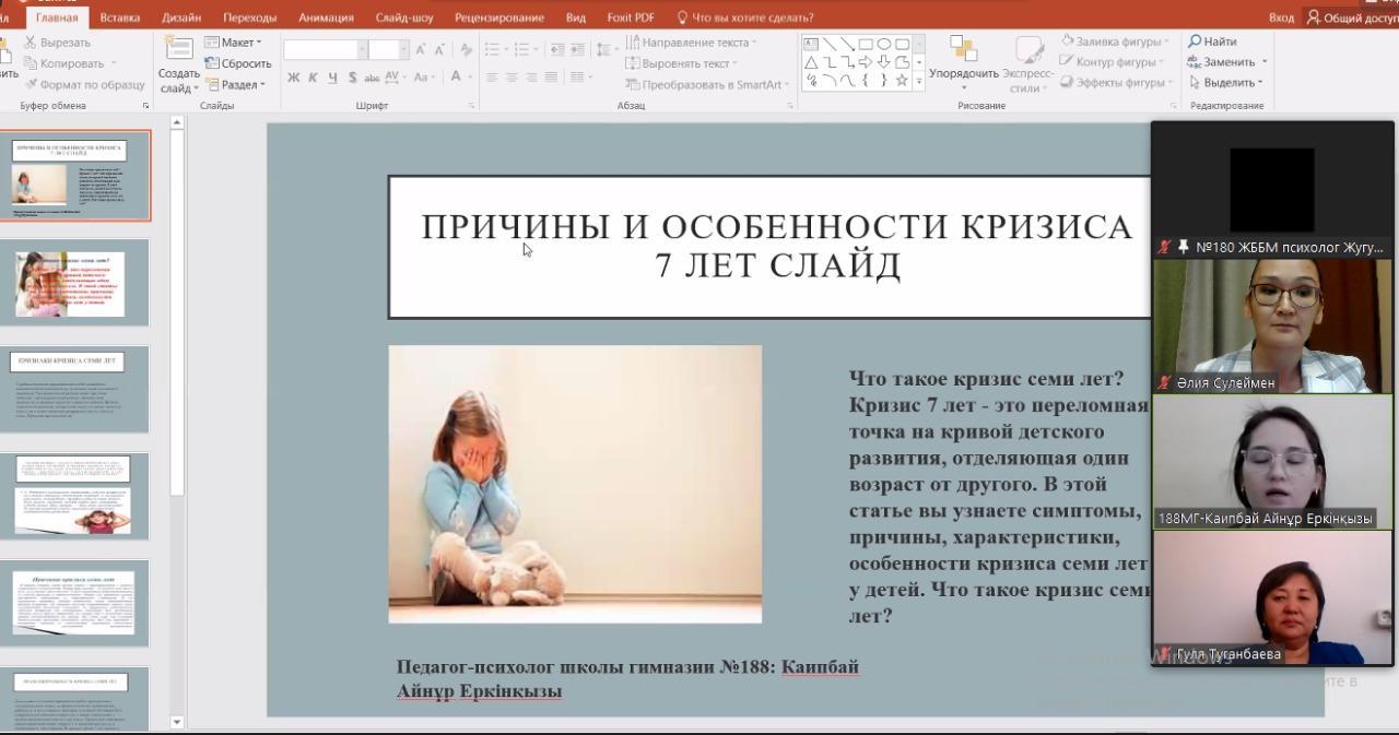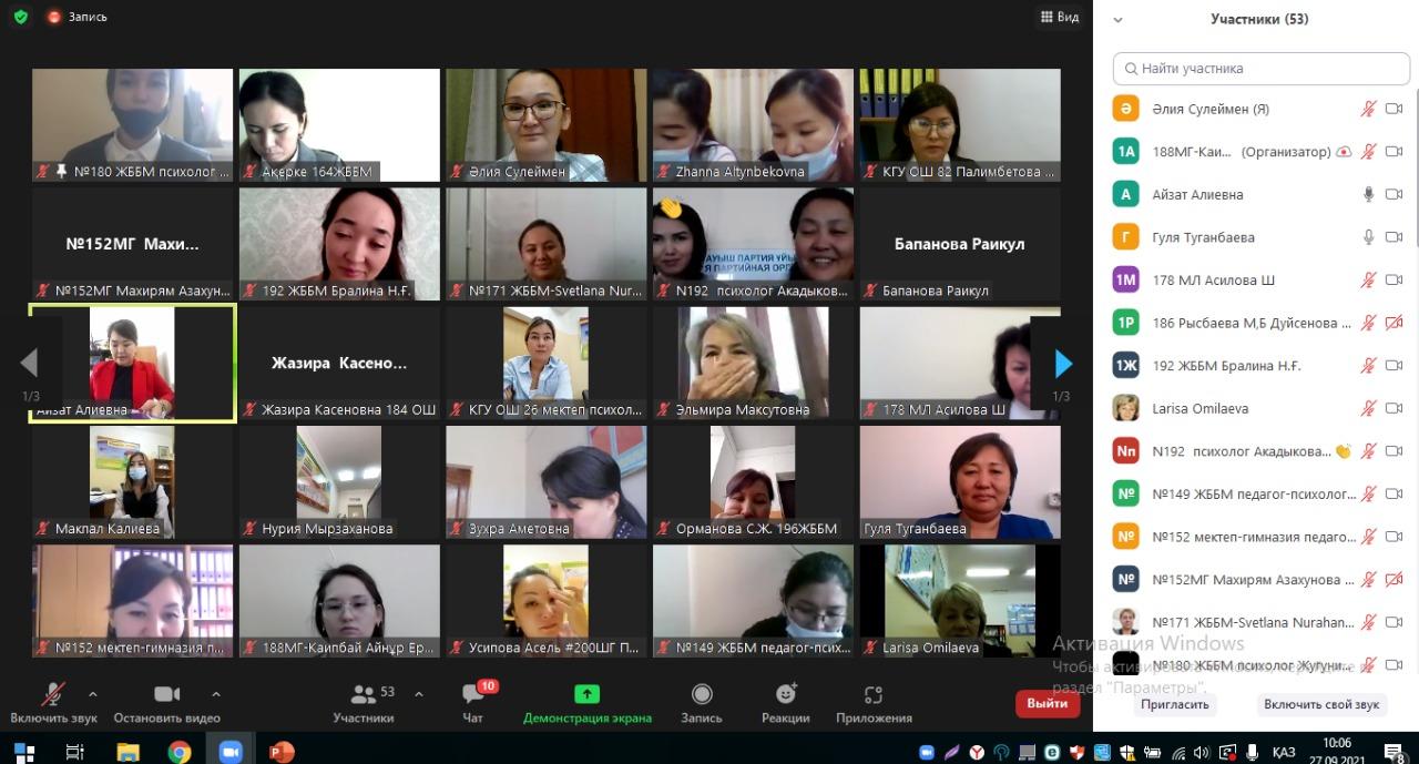 Қалалық білім берудегі жаңа технологиялардың ғылыми-әдістемелік орталығы «Психологиялық сүйемелдеу» бөлімінің ұйымдастыруымен мектеп оқушыларының психологиялық-педагогикалық мәдениетін арттыру бойынша өткізілген іс-шарада №200 мектеп-гимназия педагог-психологі Сүлеймен Әлия Сатыбалдықызы «Мұғалімнің басты құндылығы – баланың дамуы» тақырыбында баяндама жасады. Баяндамада психолог маман ретінде мұғалімнің бойындағы шынайылық пен байқампаздық қасиеттер арқылы, баланың ішкі дүниесіне үңіліп, жүрегіне жол таба білетіндігі туралы айтылды. Сондықтан мұғалімдерді осы қасиеттерге мамандануға, қыр-сырын үйрететін әдіс-тәсілдерді зерделеуге және қолдануға шақырды. Себебі мұғалім оқушының ішкі уәжін көре отырып, мотивация бере білсе, көзі жанып тұрған оқушы педагогтің тиімді жұмысының нәтижесі болып табылары сөзсіз.