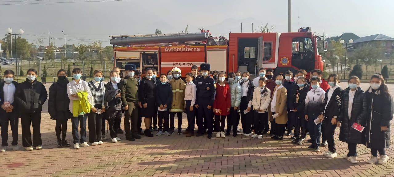 Дәріс барысында оқушылардың негізгі назары өмір қауіпсіздігі негіздеріне аударылды. Департамент қызметкерлері оларды төтенше жағдайлардың пайда болу себептері мен түрлерімен және оларды жою тәсілдерімен таныстырды. Олар өрттің негізгі себептері мен қауіпті факторлары, тұтану мен өртті жою шаралары, сондай-ақ су айдындарындағы жүріс-тұрыс ережелері туралы айтып берді. Алғашқы өрт сөндіру құралдарын практикалық пайдалану, алғашқы дәрігерге дейінгі көмек көрсету мысалдары көрсетілді.