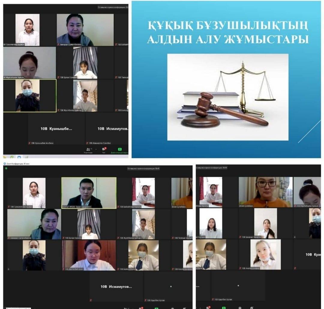 2022 жылдың 21 қаңтар күні «Құқық бұзушылықтың алдын алу мақсатында» Наурызбай ауданының ПБ ЖПҚ полиция майоры А.Б.Алимкулова мен директордың тәрбие ісі жөніндегі орынбасарлары Е.С.Рахманбердиев және А.Л.Салкинбекованың ұйымдастыруымен 9 - 10 сынып оқушылары арасында онлайн форматта жиналыс өткізілді.