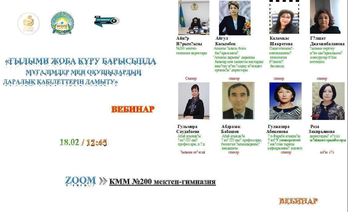 Алматы қаласы Наурызбай ауданы №200 мектеп-гимназияда директордың оқу ісі жөніндегі орынбасары Р.А Закирьянованың ұйымдастыруымен қалалық «Ғылыми жоба құру барысында мұғалімдер мен оқушылардың даралық қабілеттерін дамыту» деген тақырыпта вебинар өтті. Оған Алматы қаласы білім басқармасының «Алматы дарыны» дарынды балалар мен талантты жастарды анықтау және қолдау жөніндегі орталығының педагогикалық-инновациялық технология бөлімінің басшысы К.Шакретовна, ғылыми-зерттеу және шығармашылық конкурстар бөлім жетекшісі Г.Джаманбаланова, Абай атындағы ҚазҰПУ-дың профессоры, п.ғ.д Г.Саудабаева, Абай атындағы ҚазҰПУ-дың профессоры, биология ғылымдарының кандидаты А.Бабашев және Әл-Фараби атындағы ҚазҰУ университеті Қазақстан тарихы кафедрасының доценті Г.Абикенова қатысты.