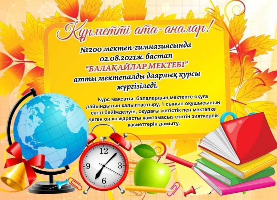 №200 мектеп-гимназиясында 02.08.2021ж. бастап "Балақайлар мектебі" атты мектепалды даярлық курсы жүргізіледі.