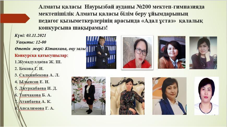 Алматы қаласы білім беру ұйымдарының педагог қызметкерлері арасында «Адал ұстаз» қалалық конкурсының мектепішілік кезеңі 1 тур- қатысушының «Адал ұстаз. Заманауи мұғалім тұлғасы» тақырыбындағы жазған эссесі, 2 тур- қатысушының «Педагогикалық адалдық- кәсіби абырой» тақырыбындағы мұғалімнің кәсіби шығармашылығының тұжырымдамалық негіздерінің таныстырылымы болды. Конкурстың аудандық кезеңіне қатысуға ағылшын тілі пәні мұғалімі Ж.Ш. Жумдуллаева және қазақ тілі мен әдебиеті пәні мұғалімі И.Д. Джуркабаева жіберілді.