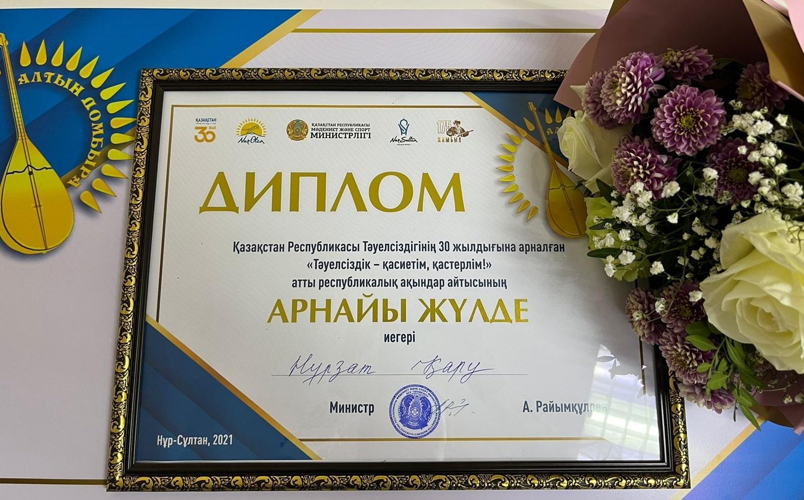ҚАЗАҚСТАН РЕСПУЛИКАСЫНЫҢ МӘДЕНИЕТ ЖӘНЕ СПОРТ МИНИСТРІ А.РАЙЫМҚҰЛОВАНЫҢ ДИПЛОМЫМЕН Қазақстан Республикасы Туелсіздігінің 30 жылдығына арналған «Тәуелсіздік – қасиетім, қастерлім!» атты республикалық ақындар айтысының Арнайы жүлде иегері қазақ тілі мен әдебиеті пәнінің мұғалімі Қару Нұрзат Талғатқызы марапатталды.