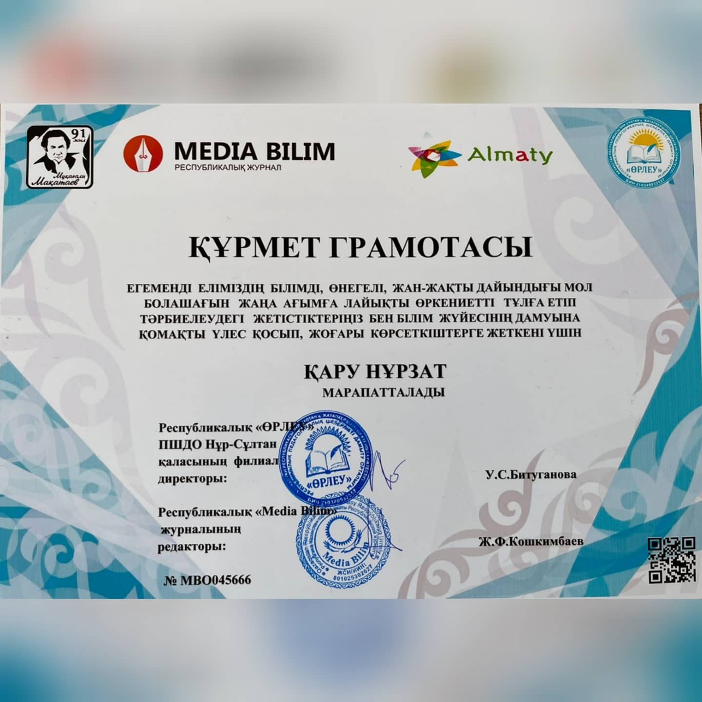«Мұқағали Мақатаев- 90жыл» төсбелгісімен және Республикалық «Өрлеу» ПШДО Нұр-Сұлтан қаласы филиалының Құрмет грамотасымен марапатталады.