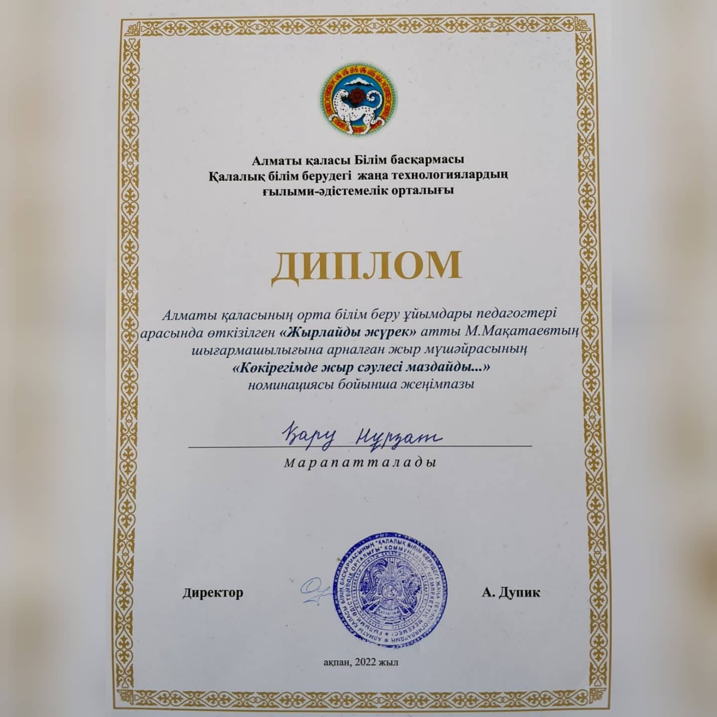 Алматы қаласында 25 ақпан күні қалалық білім берудегі жаңа технологиялардың ғылыми - әдістемелік орталығы Алматы қаласының орта білім беру педагогтері арасында ұйымдастырған «Жырлайды жүрек» атты М.Мақатаевтың шығармашылығына арналған жыр мүшәйрасының қалалық кезеңінде №200 мектеп- гимназияның қазақ тілі мен әдебиеті пәні мұғалімі Н.Қару III орынды жеңіп алып, Қазақстан Республикасы «Өрлеу» порталының «Мұқағали Мақатаев- 90жыл» төсбелгісімен және Республикалық «Өрлеу» ПШДО Нұр-Сұлтан қаласы филиалының Құрмет грамотасымен марапатталады.