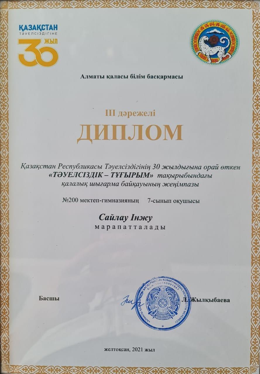 Алматы қаласы Білім басқармасының ұйымдастыруымен Қазақстан Республикасы Тәуелсіздігінің 30 жылдығына орай өткен "Тәуелсіздік-тұғырым" тақырыбындағы қалалық шығарма жазу байқауында #200 мектеп-гимназиясының 7-сынып оқушысы Сайлау Іңкәр жүлделі III дәрежелі дипломмен марапатталды. Жетекшісі: қазақ тілі мен әдебиеті пәні мұғалімі Дуйсембаева Жамила Талапхановна. Жеңістеріңіз құтты болсын!