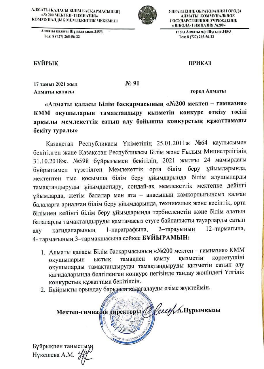 Бұйрық №101 Мектеп асханасындағы бракераж журналын жүргізу және қадағалау туралы