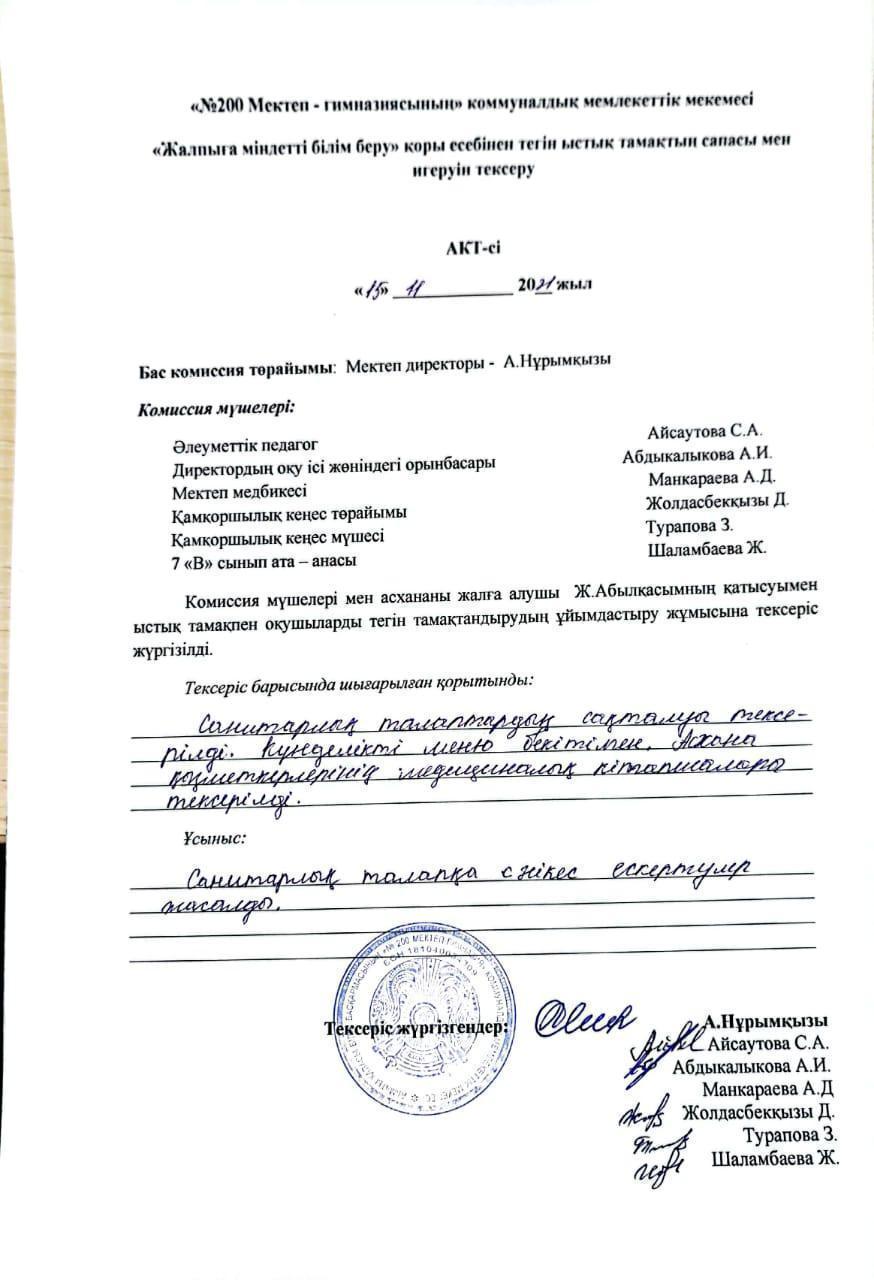 Тамақтың сапасы мен игеруін тексеру АКТ -і қараша айы 2021 ж