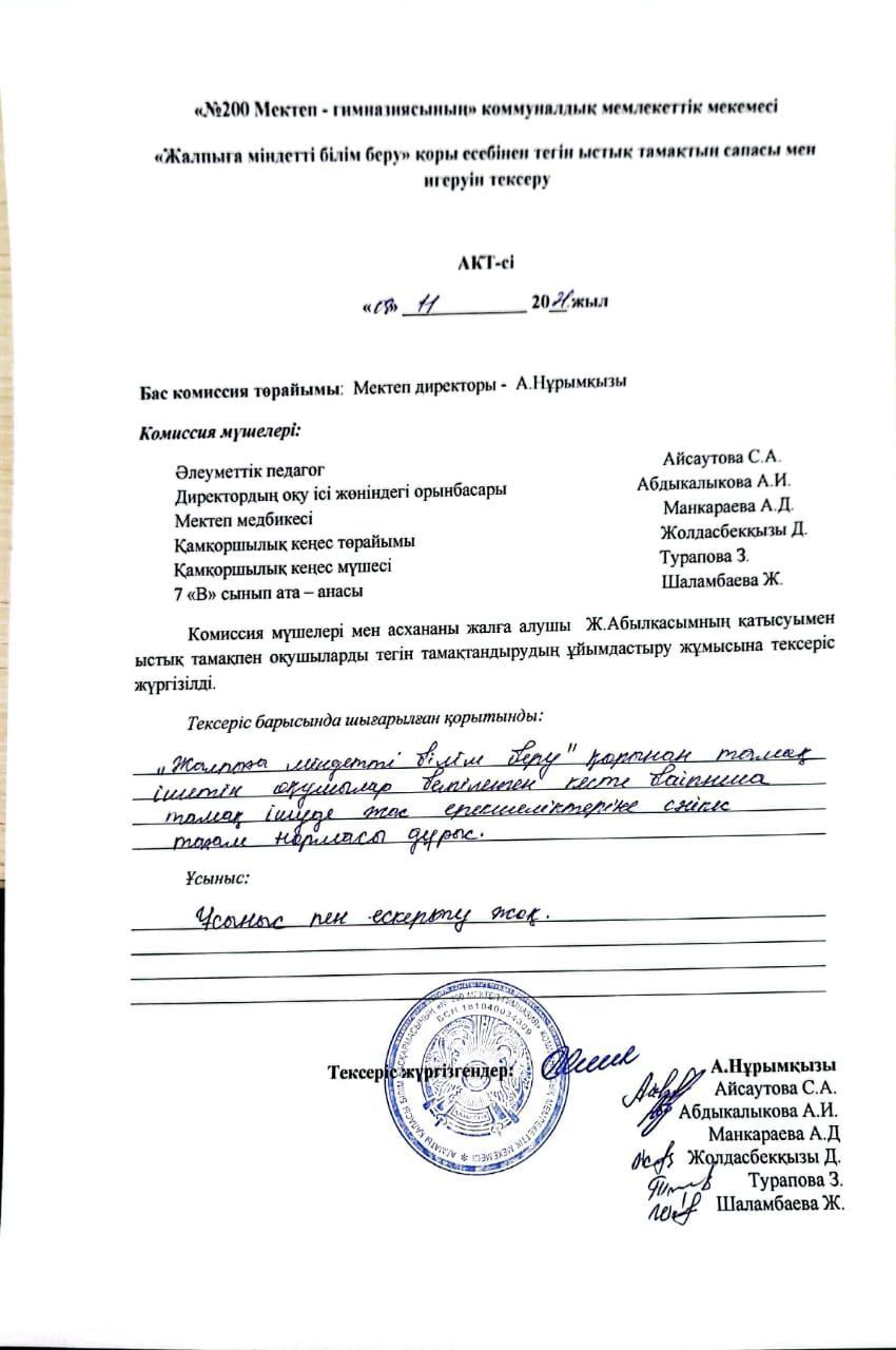 Тегін ыстық тамақтың сапасы мен игеруін тексеру АКТ-і қаңтар айы 2022