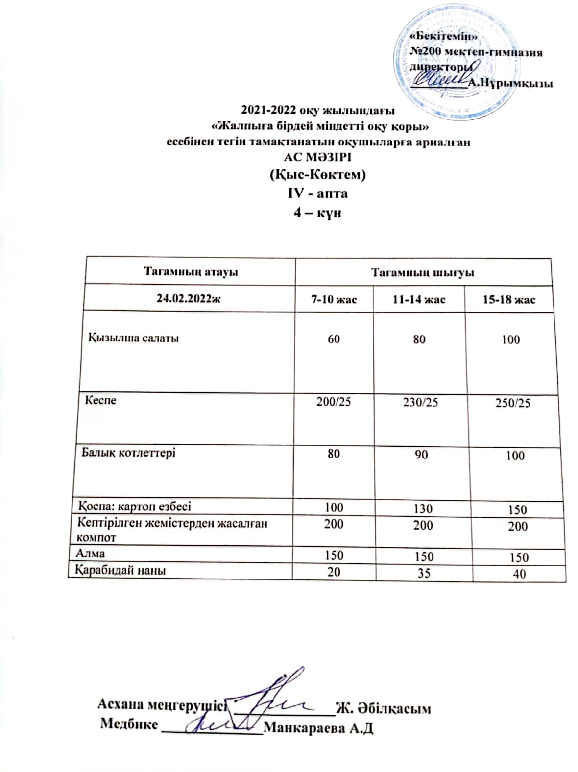 Күнделікті ас мәзірі 24.02.2022