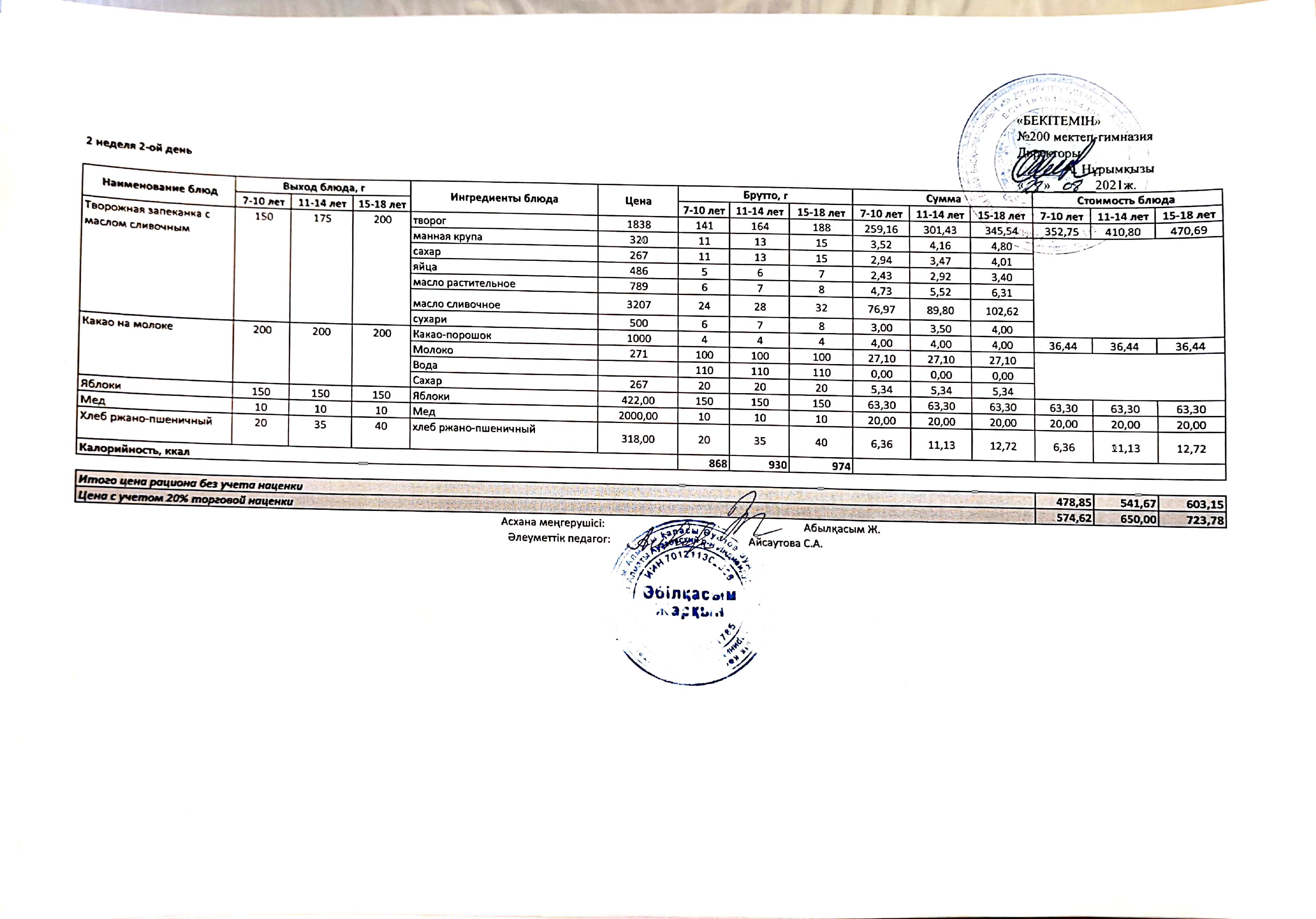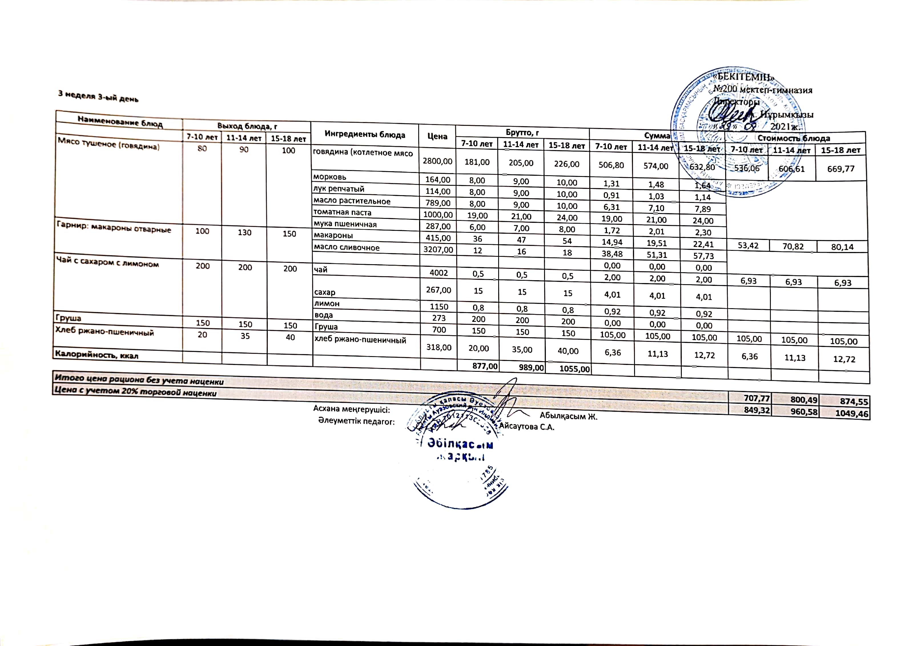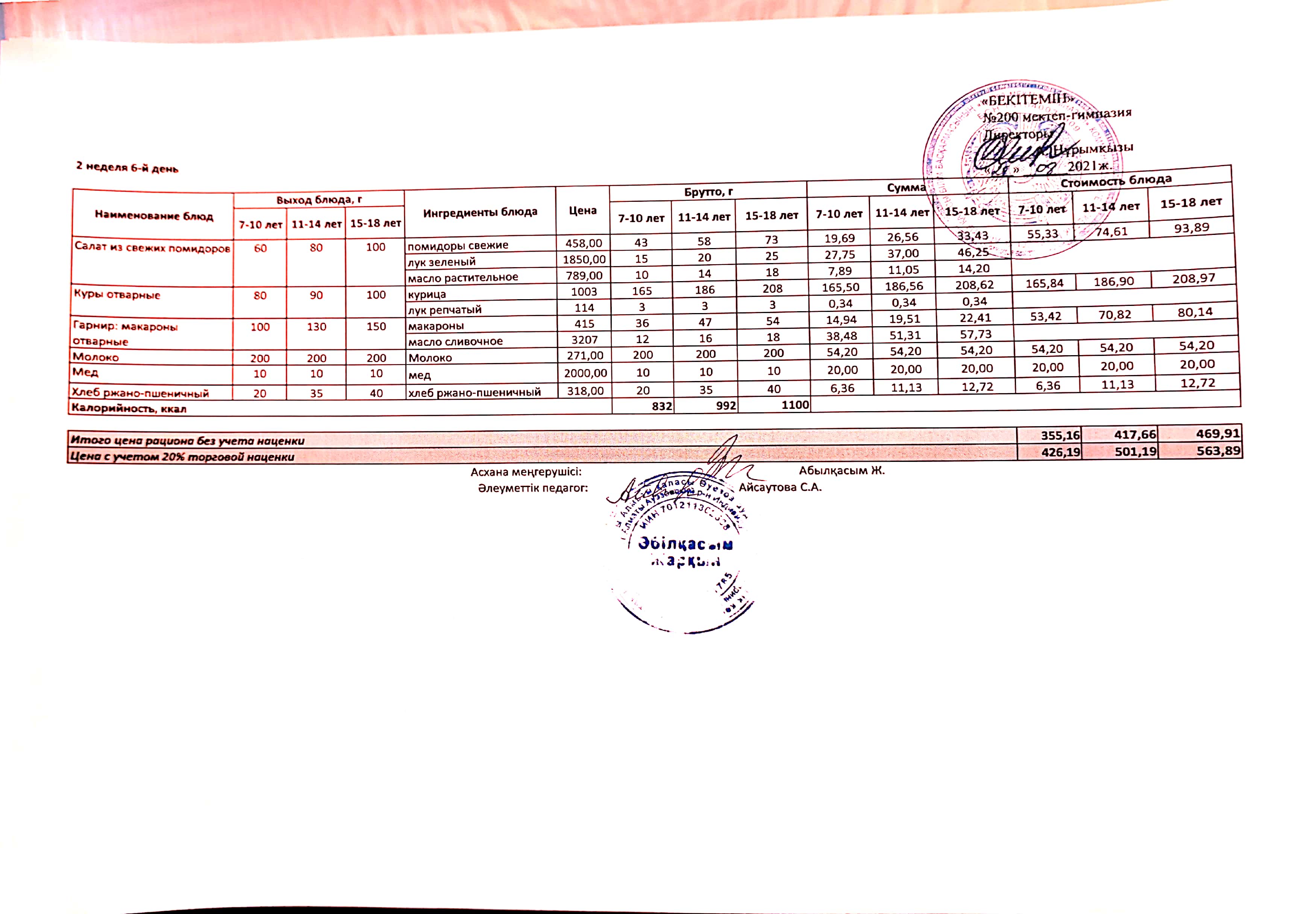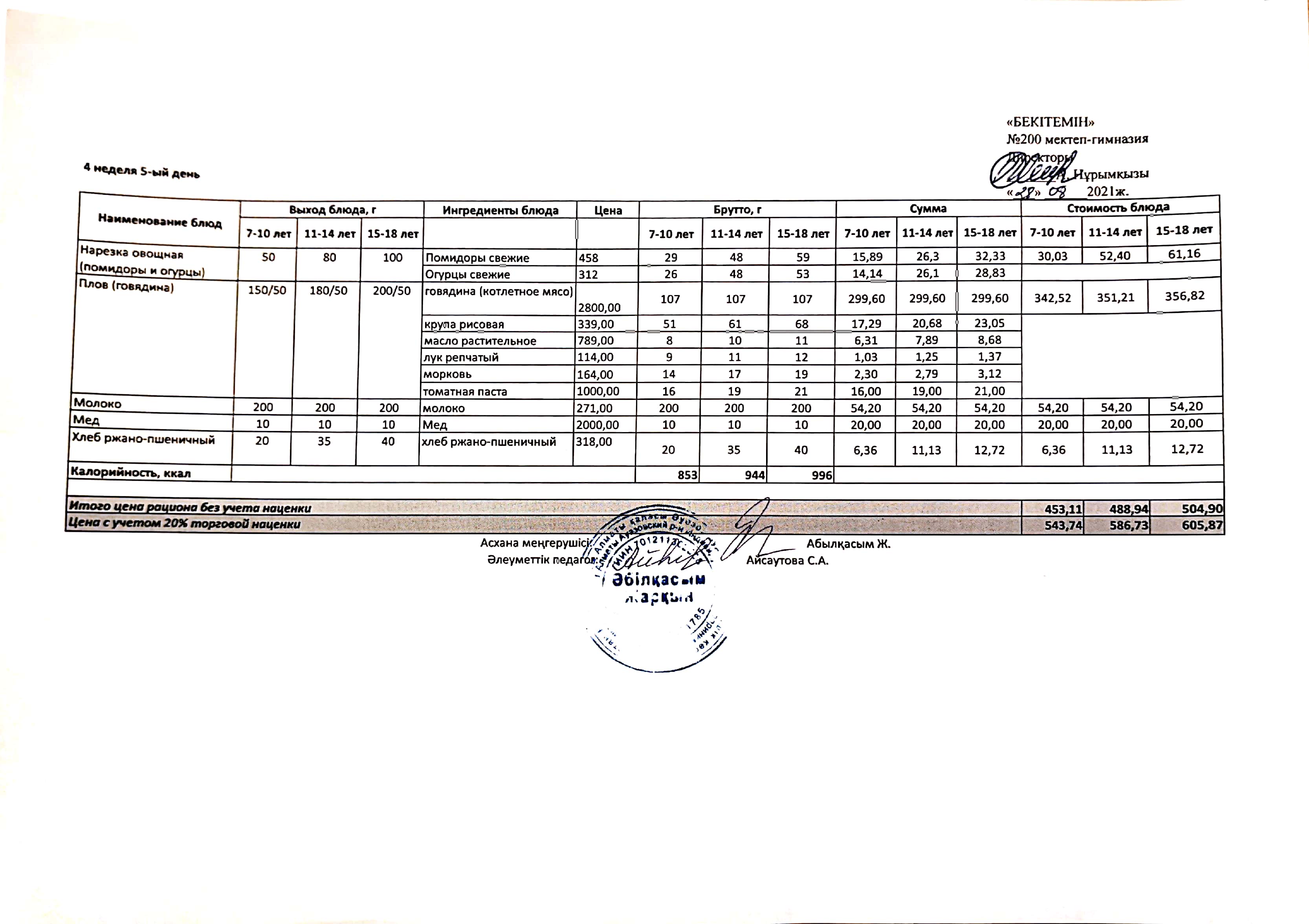 №200 мектеп - гимназиясы бойынша 2021-2022 оқу жылында асханада атқаратын кезекшілік кестесі