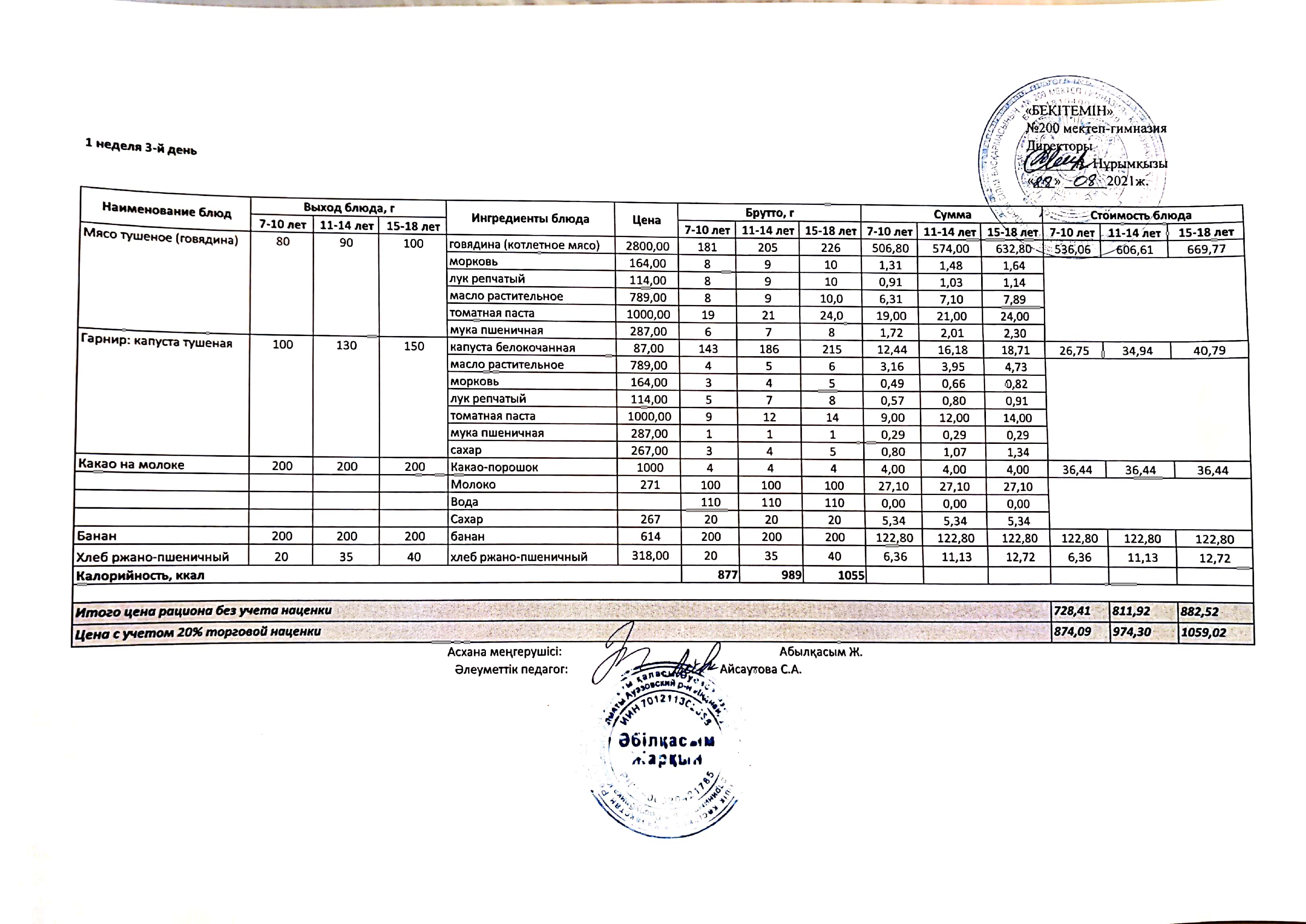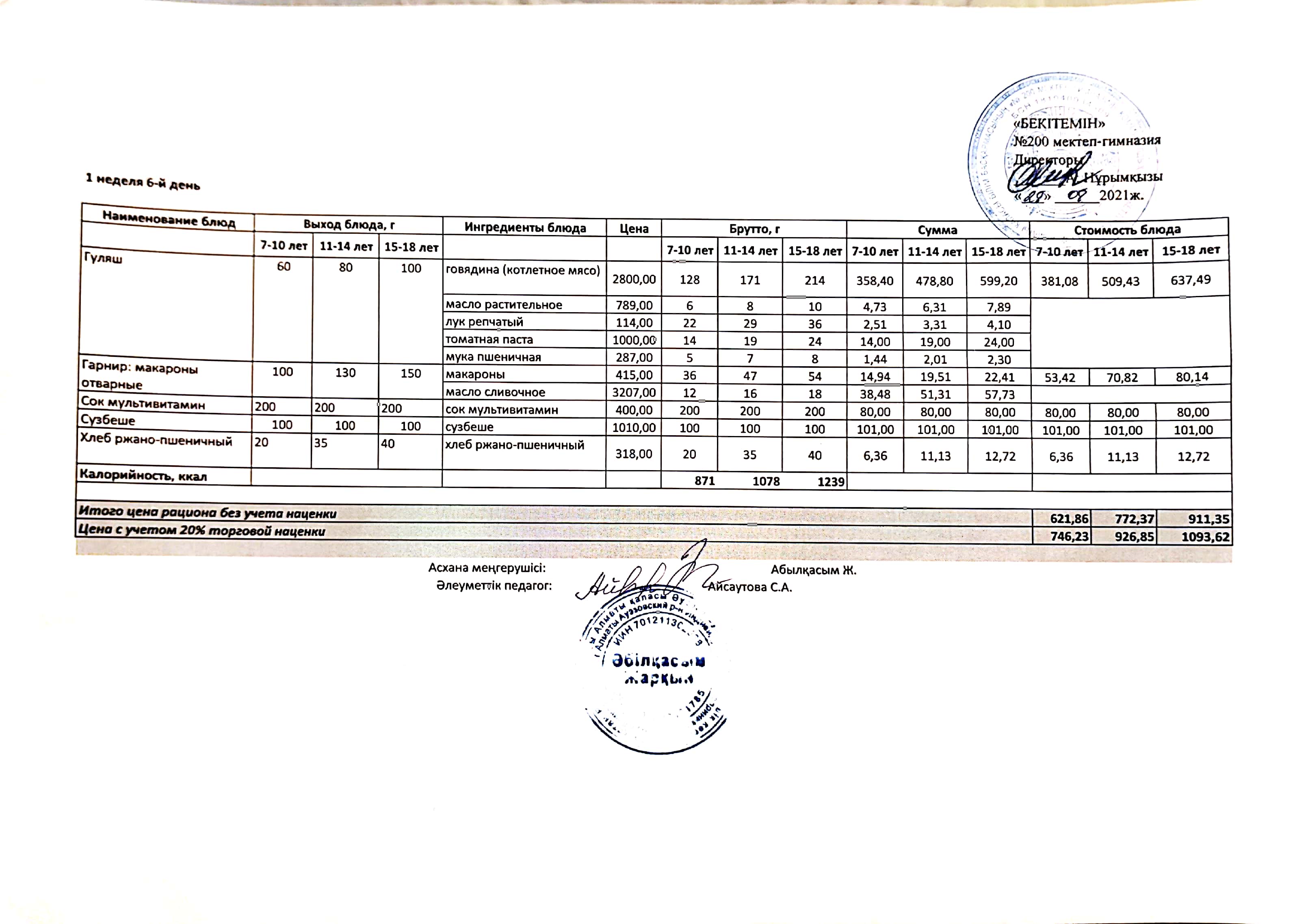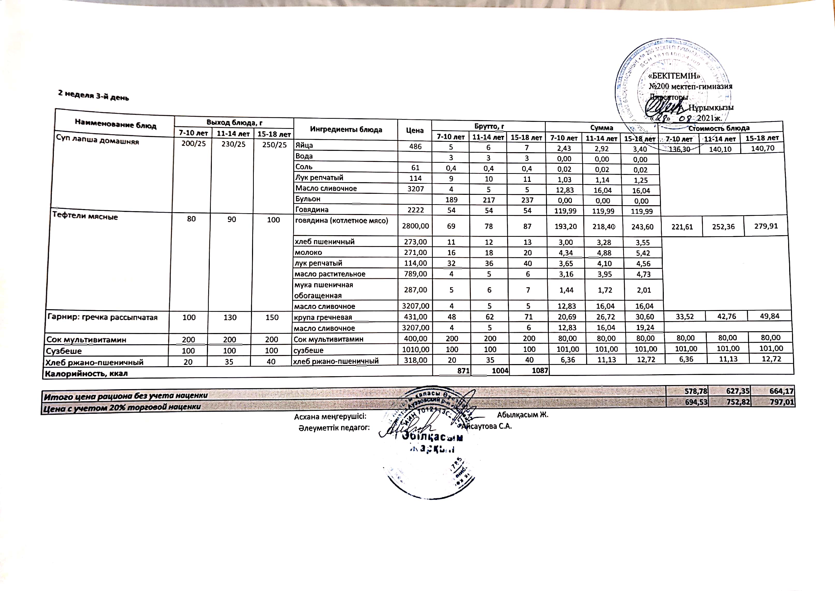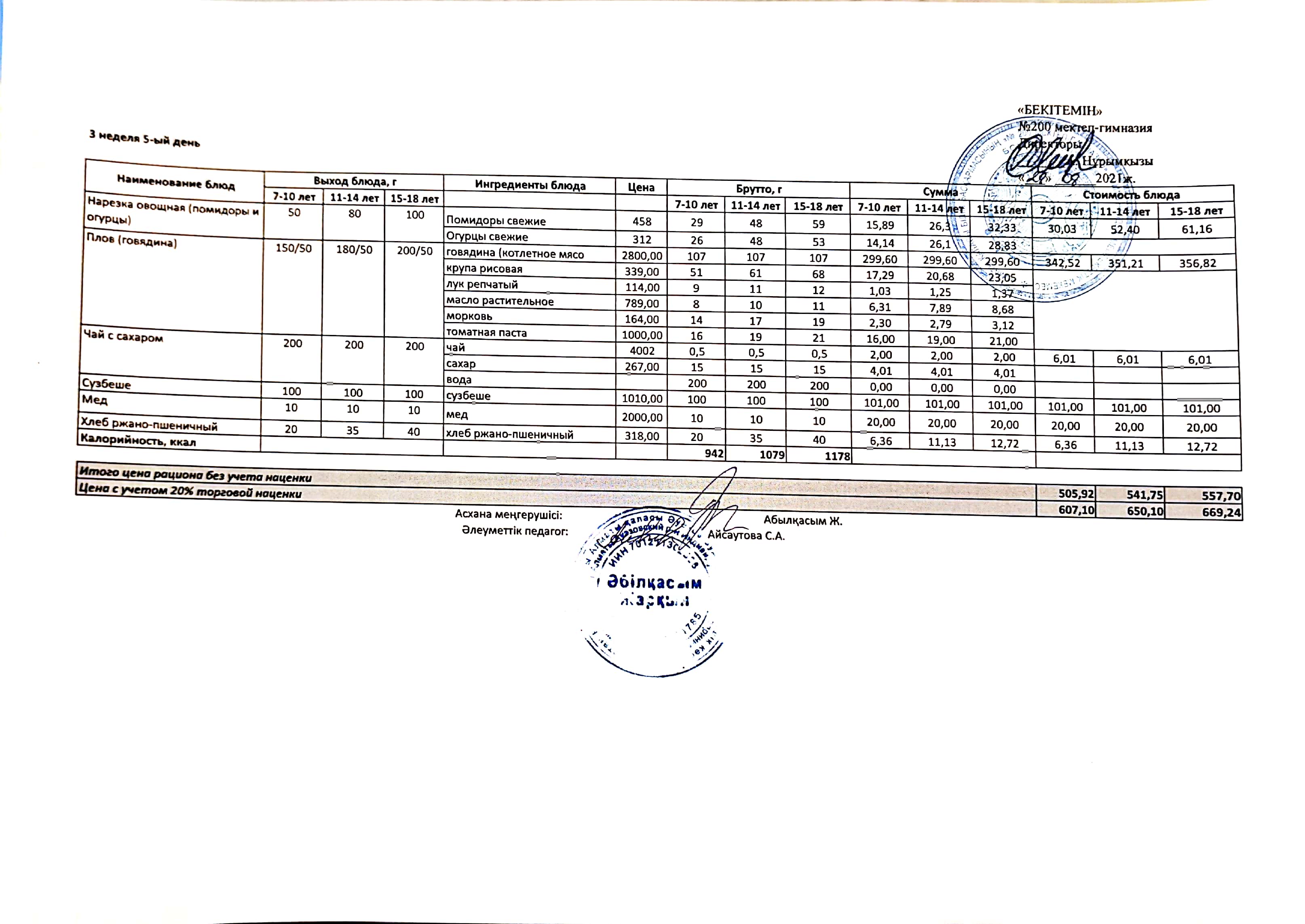 №200 мектеп - гимназиясы бойынша 2021-2022 оқу жылында асханада атқаратын кезекшілік кестесі