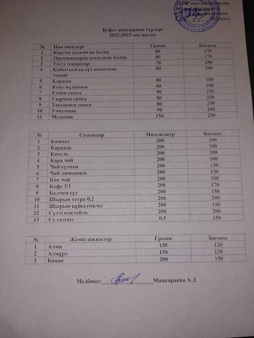 Меню платного буфетного питания с указанием цен