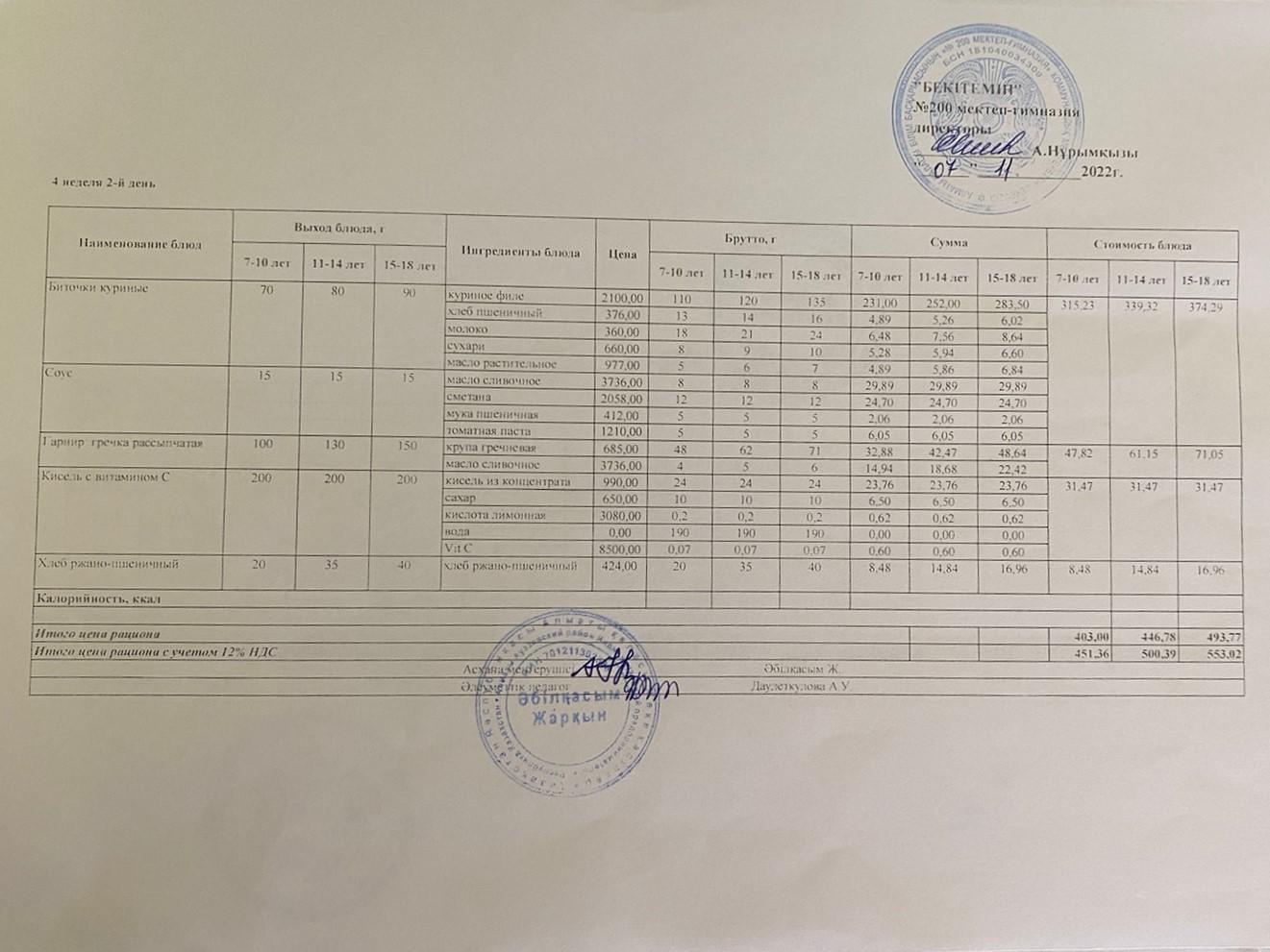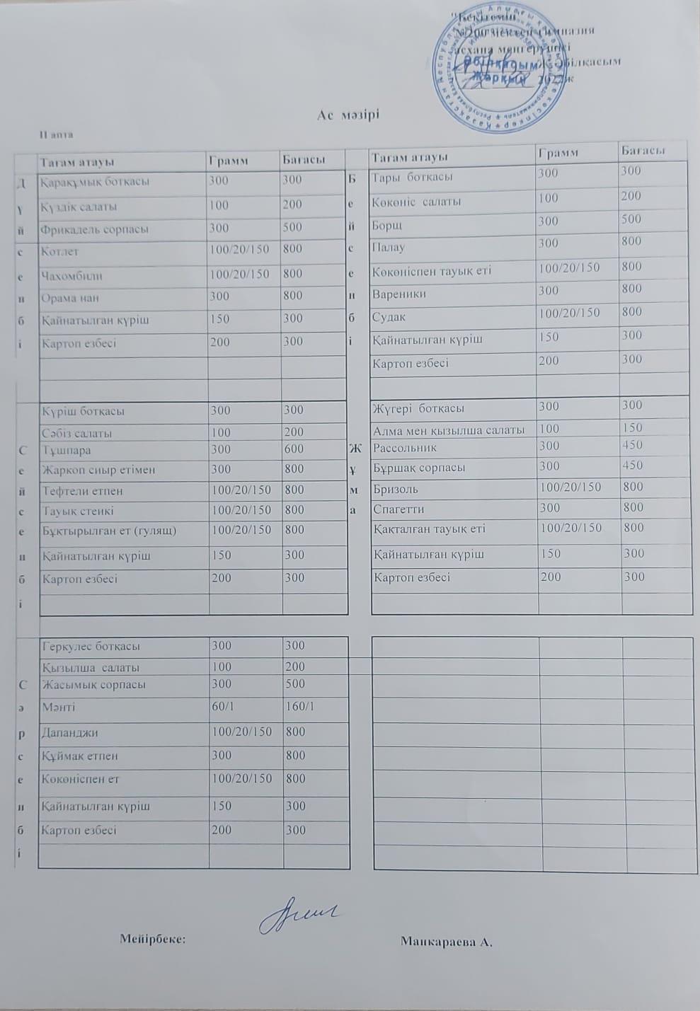 Тамақтандыру бойынша шарттар