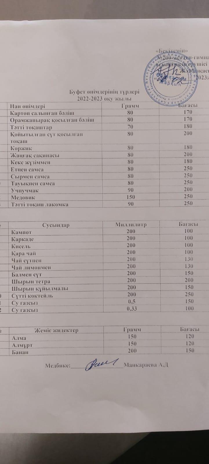 Меню платного буфетного питания с указанием цен