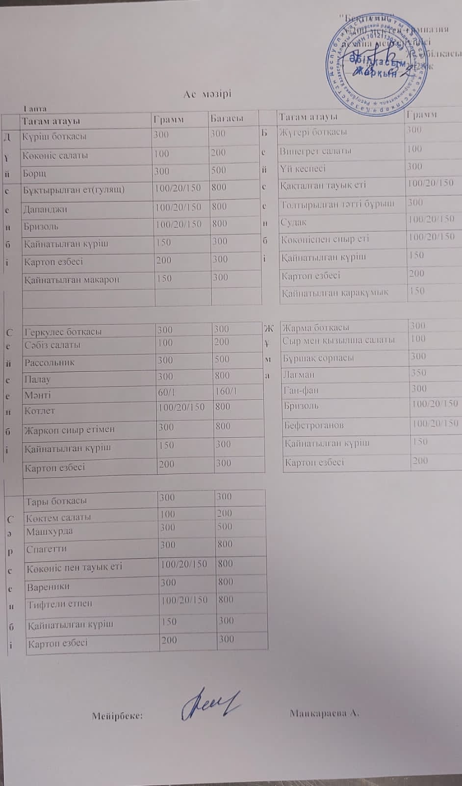 Тамақтандыру бойынша шарттар