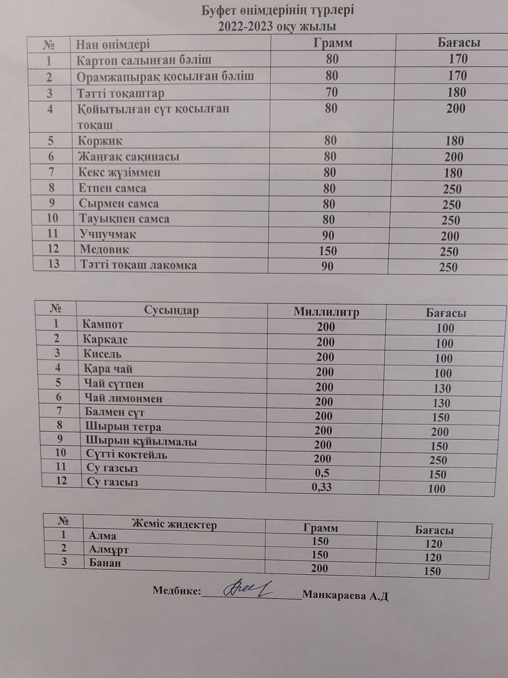 Меню платного буфетного питания с указанием цен