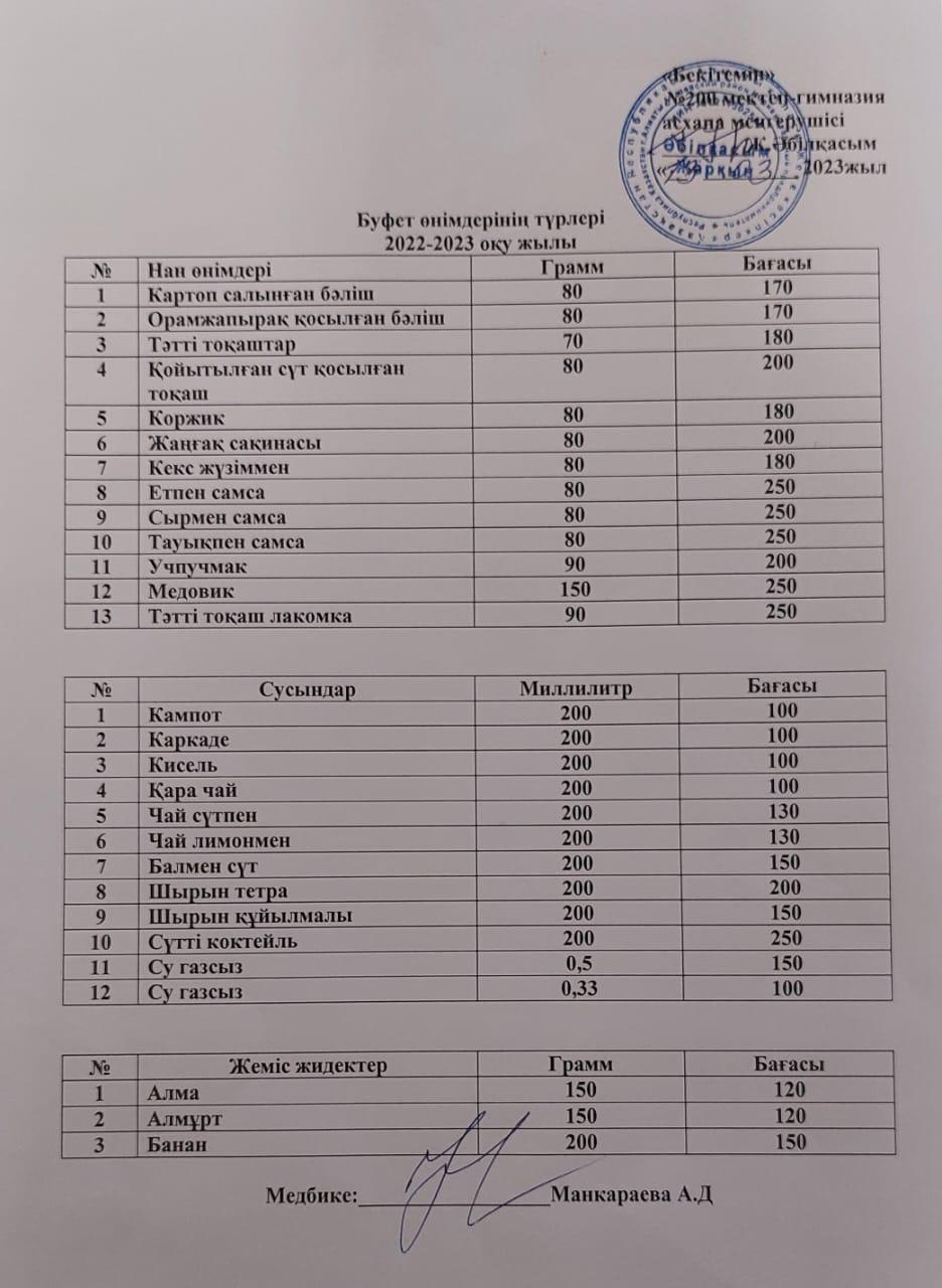 Меню платного буфетного питания с указанием цен