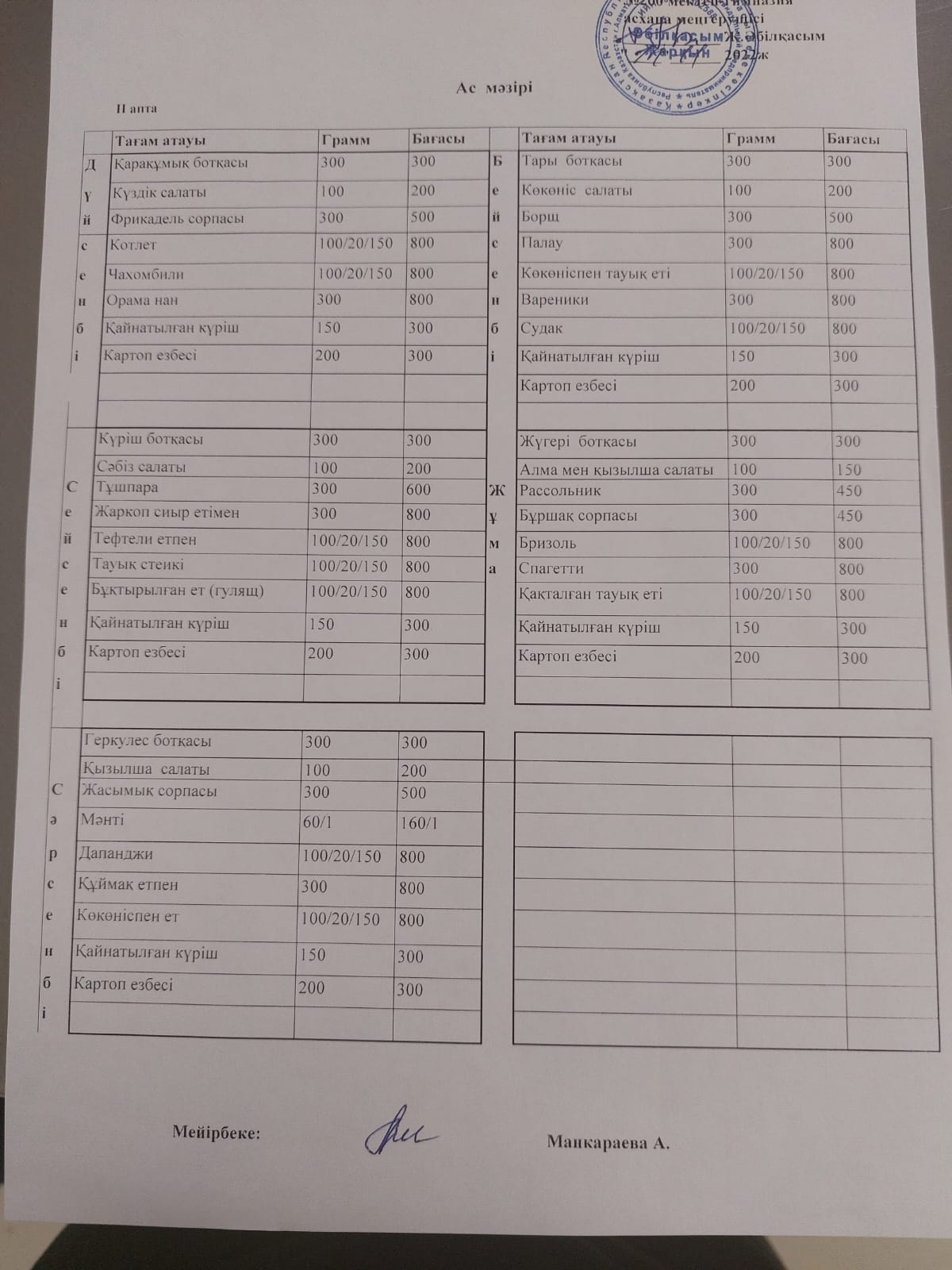Тамақтандыру бойынша шарттар