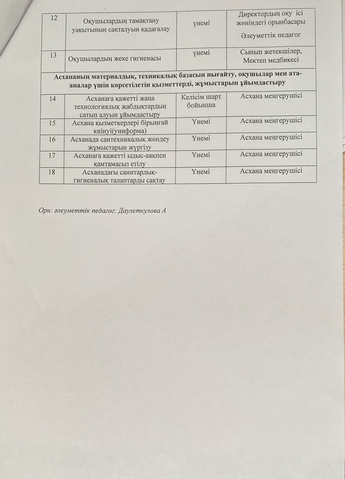 Тамақтануды ұйымдастыру бойынша жұмыс жоспары 2025-2026 оқу жылы