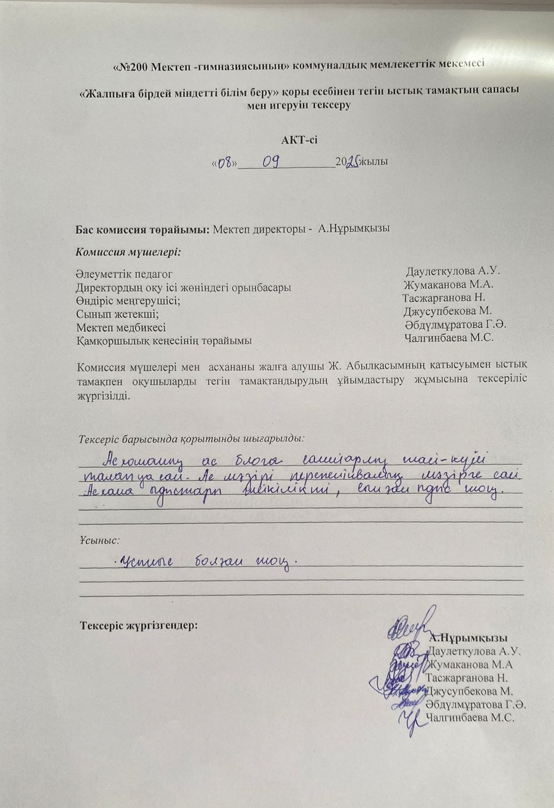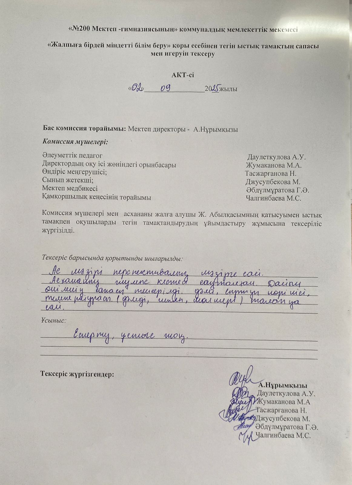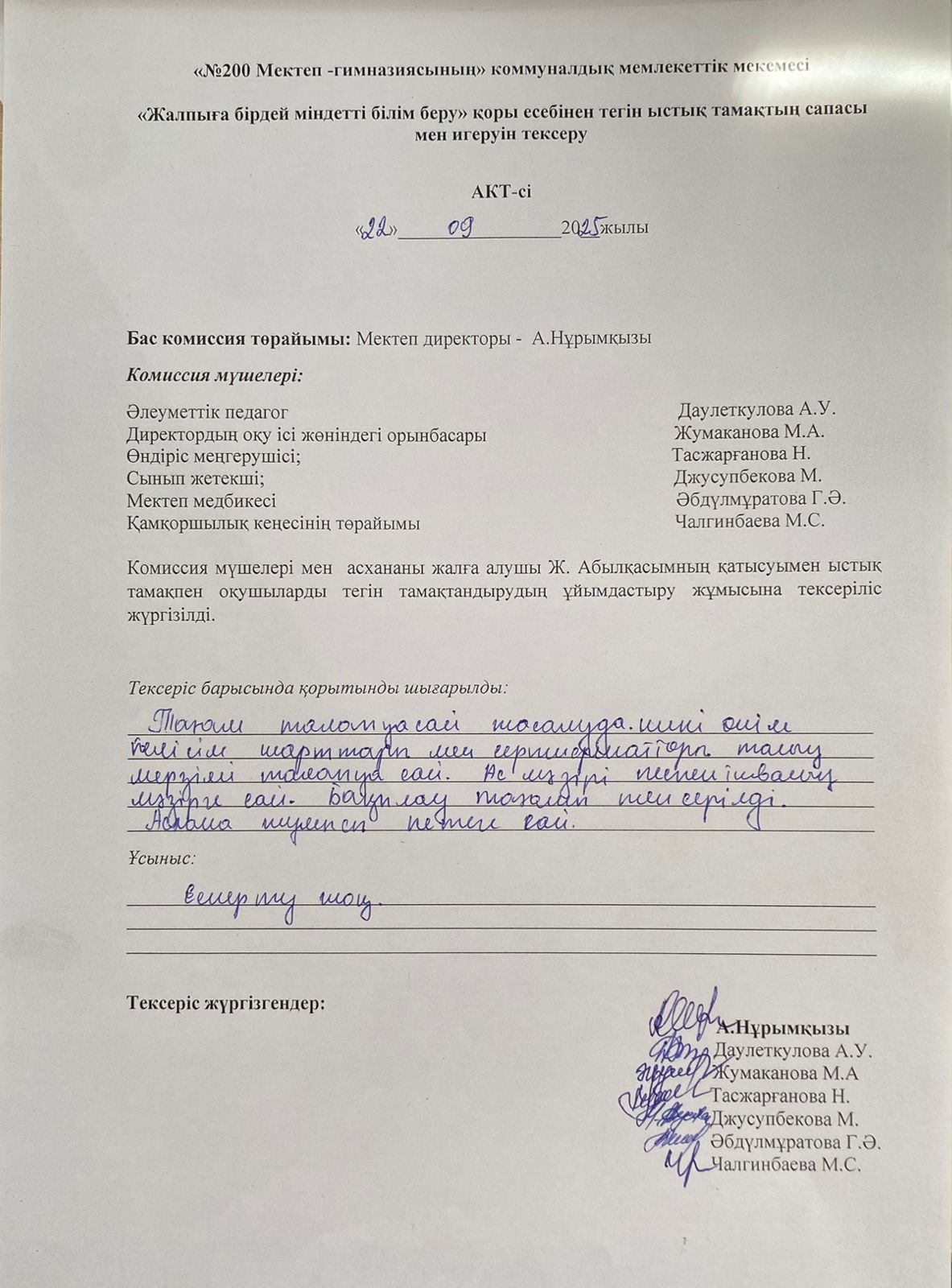 » Ыстық тамақтың сапасы мен игеруін тексеру қыркүйек айы АКТ-сі