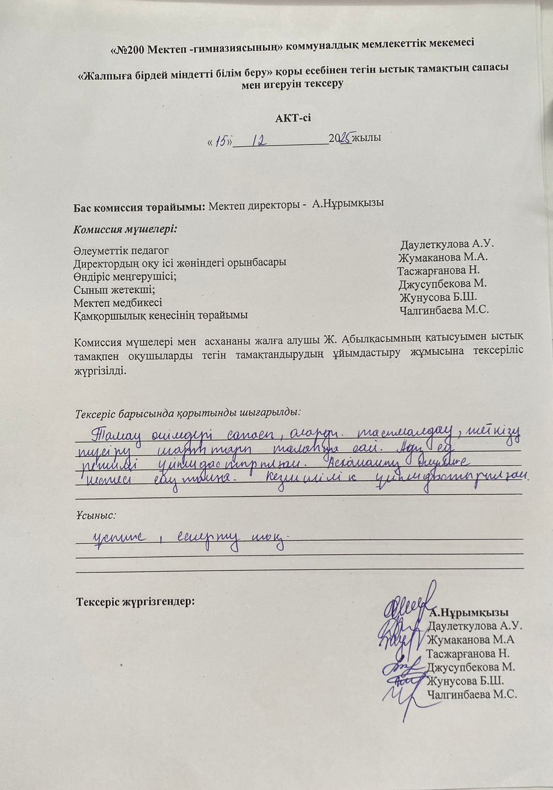 » Тегін ыстық тамақтың сапасы мен игеруін тексеру АКТ-сі Желтоқсан айы