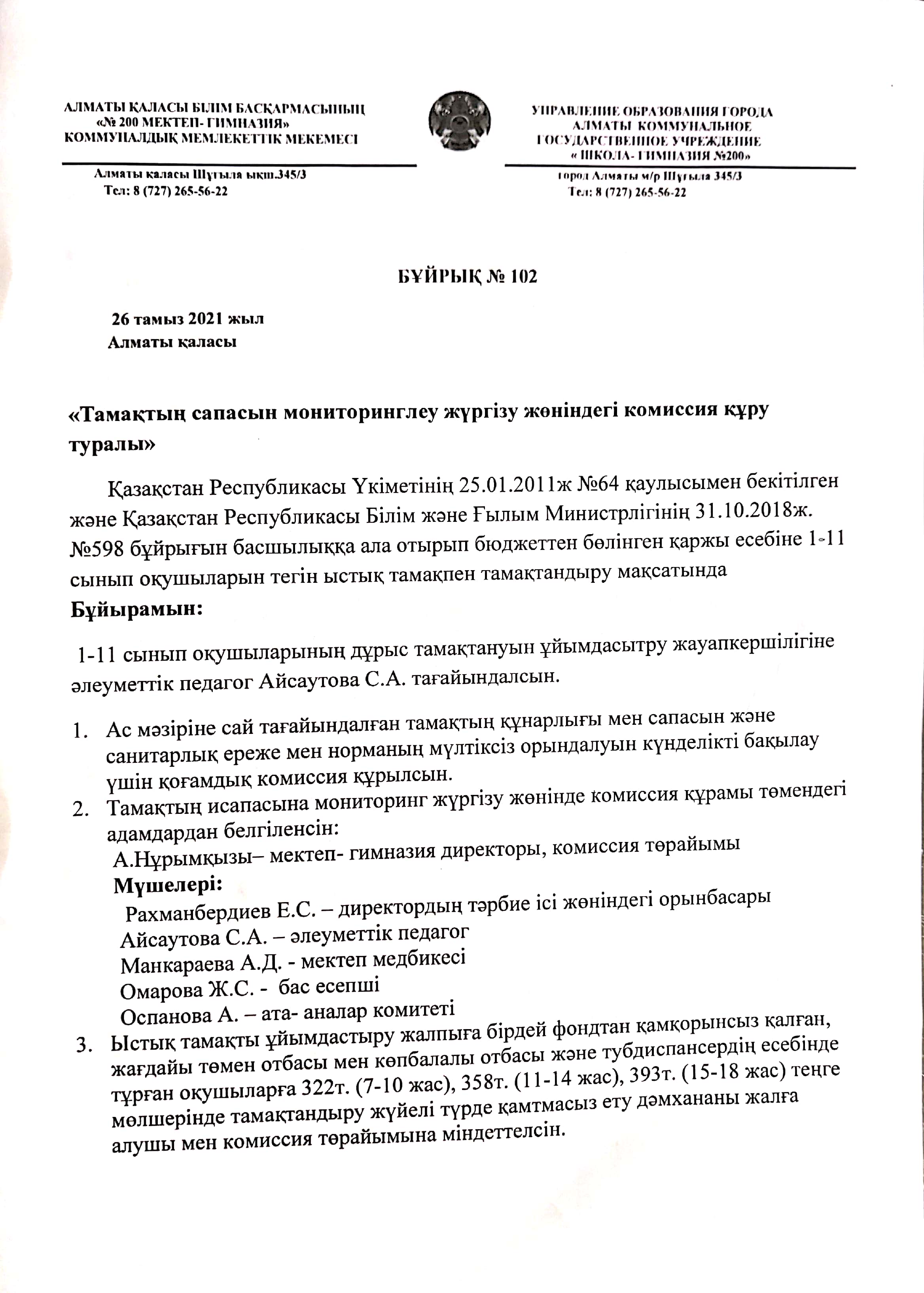 15 ноябрь 2021 0 1 2 3 4 5 Бұйрық №102 Тамақтың сапасын мониторлингілеу жүргізу жөніндегі комиссия құру туралы
